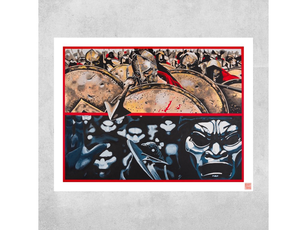 Obraz kombinuje dvě scény z filmového zpracování příběhu bitvy u Thermopyl, kde se spartský král Leonidas a jeho 300 věrných bojovníků utká s mnohonásobnou přesilou Peršanů pod vedením krále Xerxa. Odvážní Sparťané bojují až do poslední kapky krve, jejich odvaha a sebeoběť způsobí sjednocení Řeků. Tento obraz dvou proti sobě stojících armád je poctou nejen pro filmaře, kteří vytvořili ikonické dílo, ale je také poctou třem stům skutečných válečníků, kteří se odmítli podvolit mnohonásobné převaze. Silný příběh, který rozezní válečníka v každém z nás...