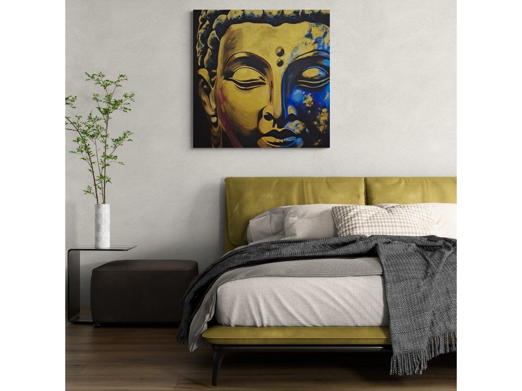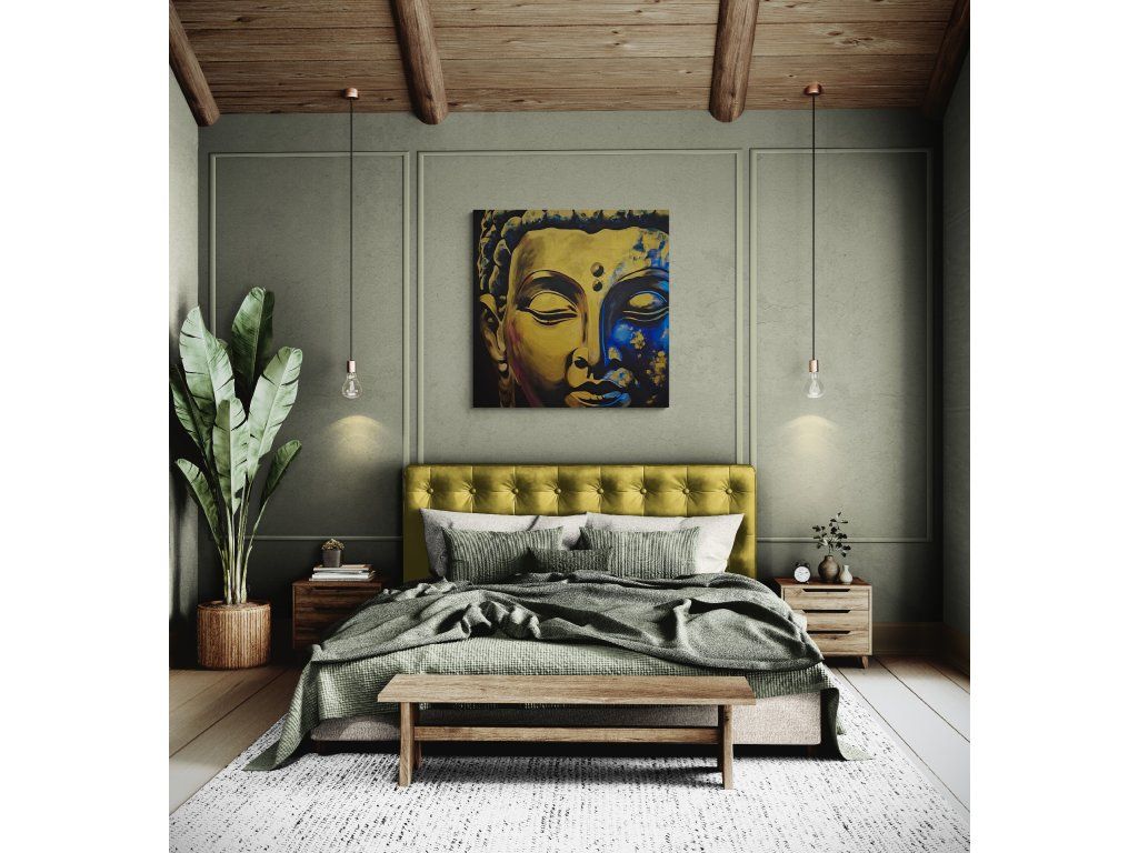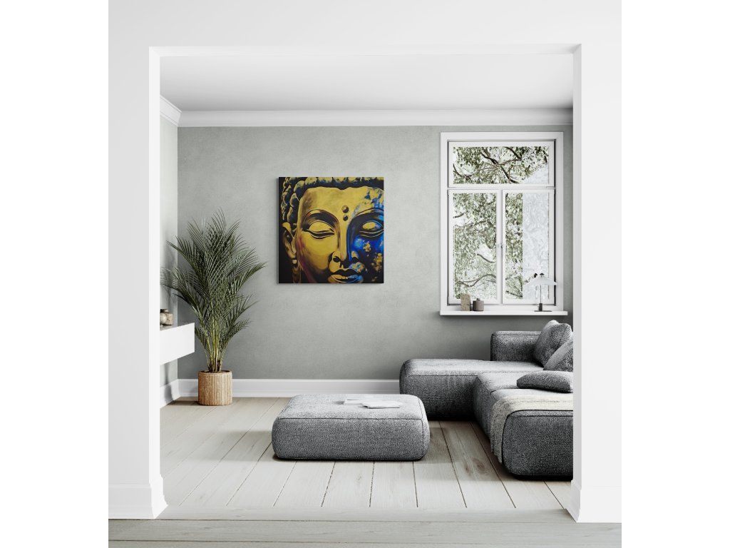 "Zlatý klid v modré hlubině" - takto obraz Buddhy popsala umělá inteligence. Nicméně tento obraz vznikl proto, aby do prostoru vnesl mír, harmonii a hluboký vnitřní klid. Buddha se zavřenýma očima je tichým průvodcem na cestě k nalezení rovnováhy v chaosu moderního světa. Nádech, výdech, ztišení srdce, okamžik absolutní přítomnosti.